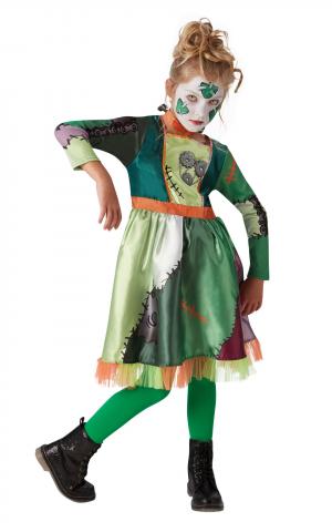 This Frankie Girl Costume - Kids is a spooky Halloween outfit and consists of a faux satin patchwork print dress and a choker with bolts.