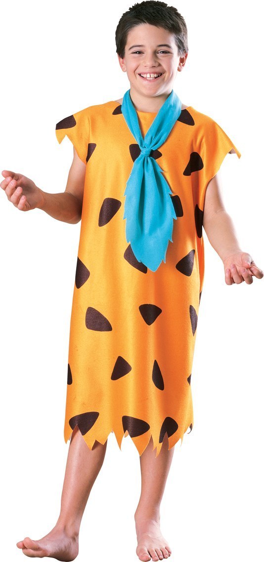 The officially licensed Fred Flintstone costume for Kids from The Flintstones features an orange and black tunic with jagged edges and a blue necktie.