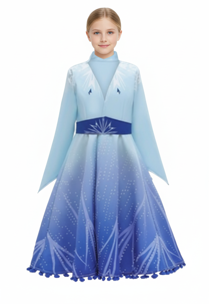 You'll be ready to whip up enchanted snowmen or a perilous blizzards once in your new Frozen Princess Elsa Costume. This costume features a long crystal-shimmery blue dress with snowflake design, removeable velcro waistband, delicate detailed sleeves with sequin and jewel. The back of the dress has a skin coloured print which gives the illusion of a backless dress to complete the look. This costume will make any girl feel magical!