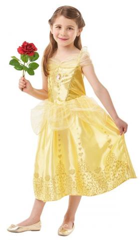 This Kids Gem Princess Belle Costume includes a beautiful golden dress with mesh off the shoulder sleeves, a satin bodice with character motif and sparkly glitter detail. The satin skirt also features an organza shimmer peplum.