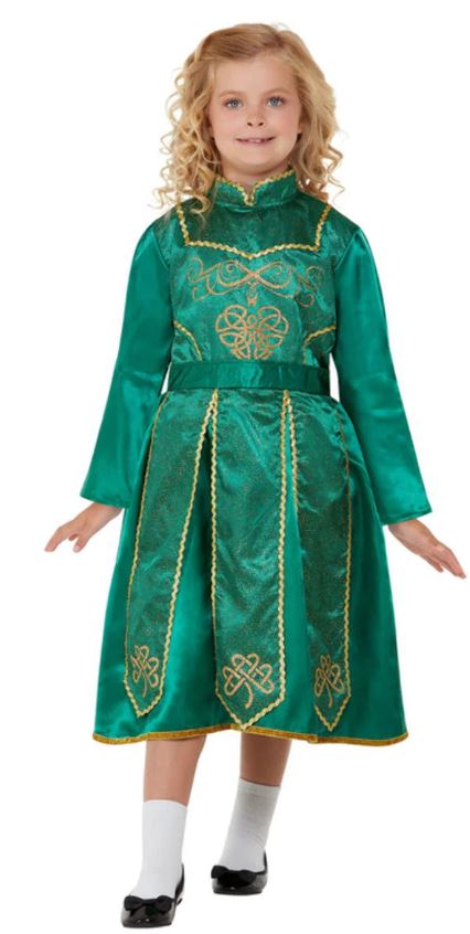 Deluxe Irish Dancer Costume comes complete with a green dress with gold embroidery detailing with Celtic patterns.
