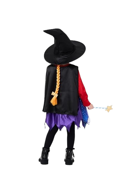 The set includes a premium dress with attached cape, matching witch’s hat, plait, and wand—everything needed for magical adventures at World Book Day, school events, and spellbinding dress-up fun.