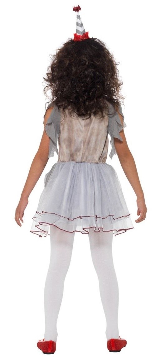 This Kids Vintage Clown Girl Costume includes a dress with a tutu style skirt and a bowtie. To complete the look a mini hat on a headband is also included.