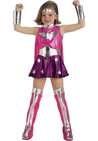Be adventurous with this pink and powerful Wonder Women Costume. It features a two coloured sleeveless dress with a metallic style round neck collar. The front of the dress also features metallic silver style star design with the Wonder Women logo displayed across the front. The top of the dress is light coloured pink compared to the dress which is dark coloured pink with large silver star designs. This costume is complete with a large silver metallic silver belt which finishes the waistline perfectly. This beautiful costume features a pair of shiny pink and silver long boot tops and is completed with a pair of silver bracelets.