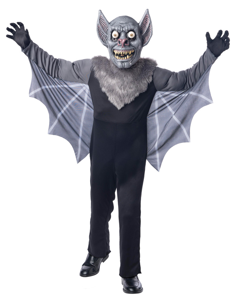 The Googly Eye Bat Costume comes with a dark grey jumpsuit with plush chest and attached wings. The costume is completed with a vacuform Mask with Googly Eyes