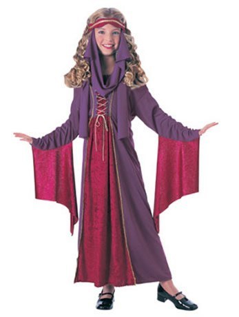 A charming Renaissance costume. This Gothic Princess Costume includes a long flowing purple dress with draping red sleeves and red opening at front of dress, black lace up the front with gold trimming detail. To complete this look a red headpiece with braided gold detailing and draping purple sash is also included.