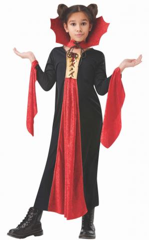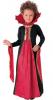 Kids Gothic Vampiress costume includes a black and red velour dress with gold trim and lace up front. To complete the look a velour collar is also included.