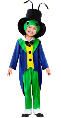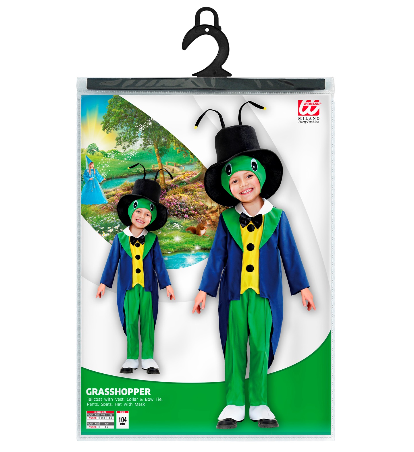 The Grasshopper costume includes a tailcoat with attached vest, collar and bow tie, also included are the trousers, spats and hat with attached mask.