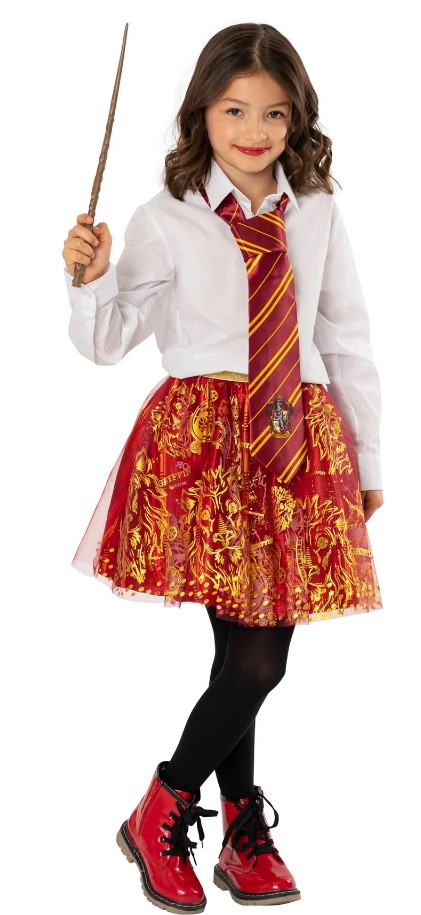 This is an officially licensed Harry Potter product. Your child will look adorable in this Harry Potter Gryffindor Skirt. It features a deluxe Gryffindor Skirt in maroon and golden colours. The skirt has satin lining with Gryffindor imagery and printing including gold foiling across the front. To complete the look, it also includes a gold elasticated glittery waistband.
