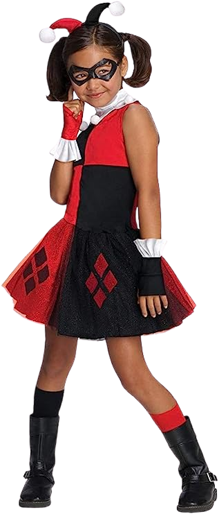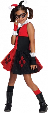 This Kids Harley Quinn Tutu Costume includes a dress with attached tutu. Costume also included a jester head piece and glovelets . To complete the look a black eyemask is also included.