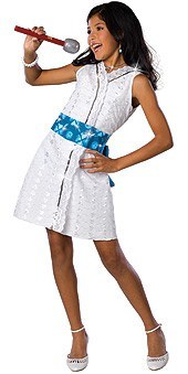 The High School Musical Gabriella Costume includes a white zip up dress with lace designs and silver sequin trail to front, attached bow with "High School Musical" Emblem and necklace.