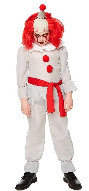 Kids Horror Clown Costume includes a top with collar and red baubles. Costume also includes a pair of trousers and a red waist sash.
