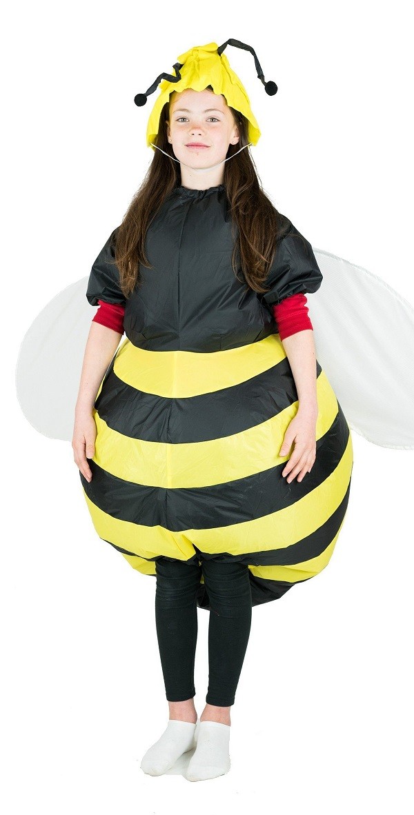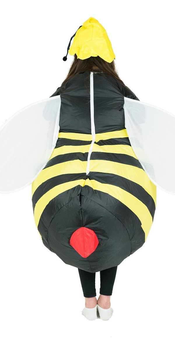 Kids Bee Inflatable Costume includes a one piece inflatable bee costume with a drawstring waist and a fan to inflate the costume. Requires 4 x AA Batteries (not included)