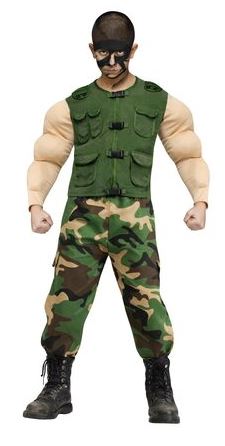 This costume includes a shirt with attached vest and faux muscle arms and camoflage pants.