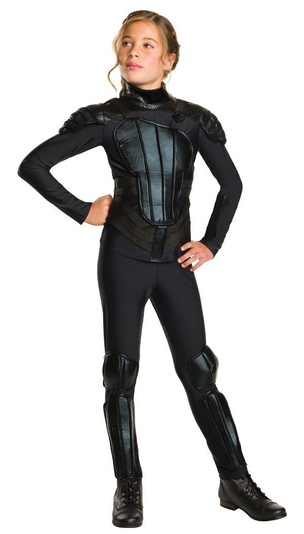 The Hunger Games Katniss Rebel Costume includes a black top with attached armour and a pair of black trousers with knee and shin guards.