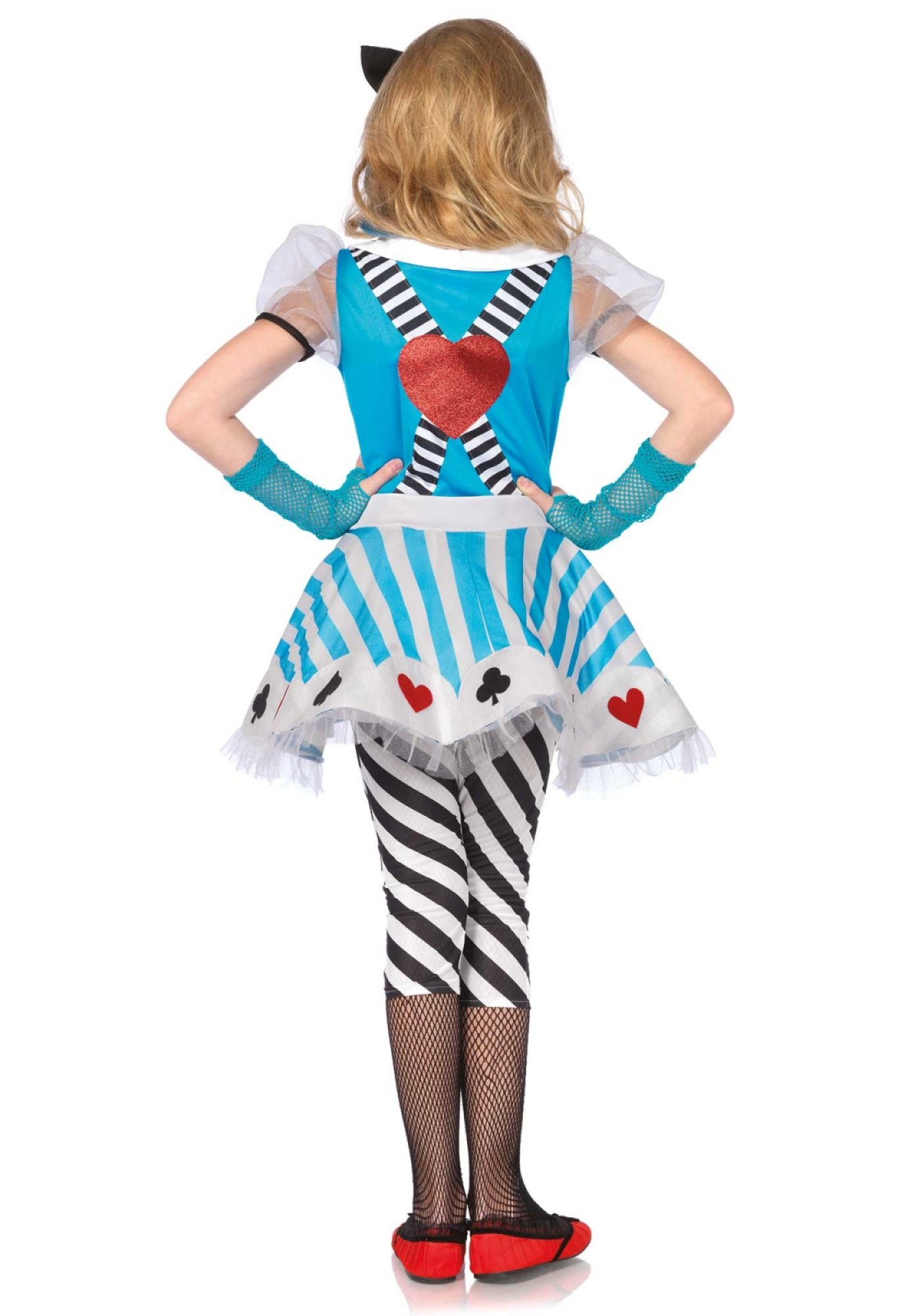 Included is an apron dress with scalloped card suit skirt and oversized button accents, striped leggings, and bow headband.