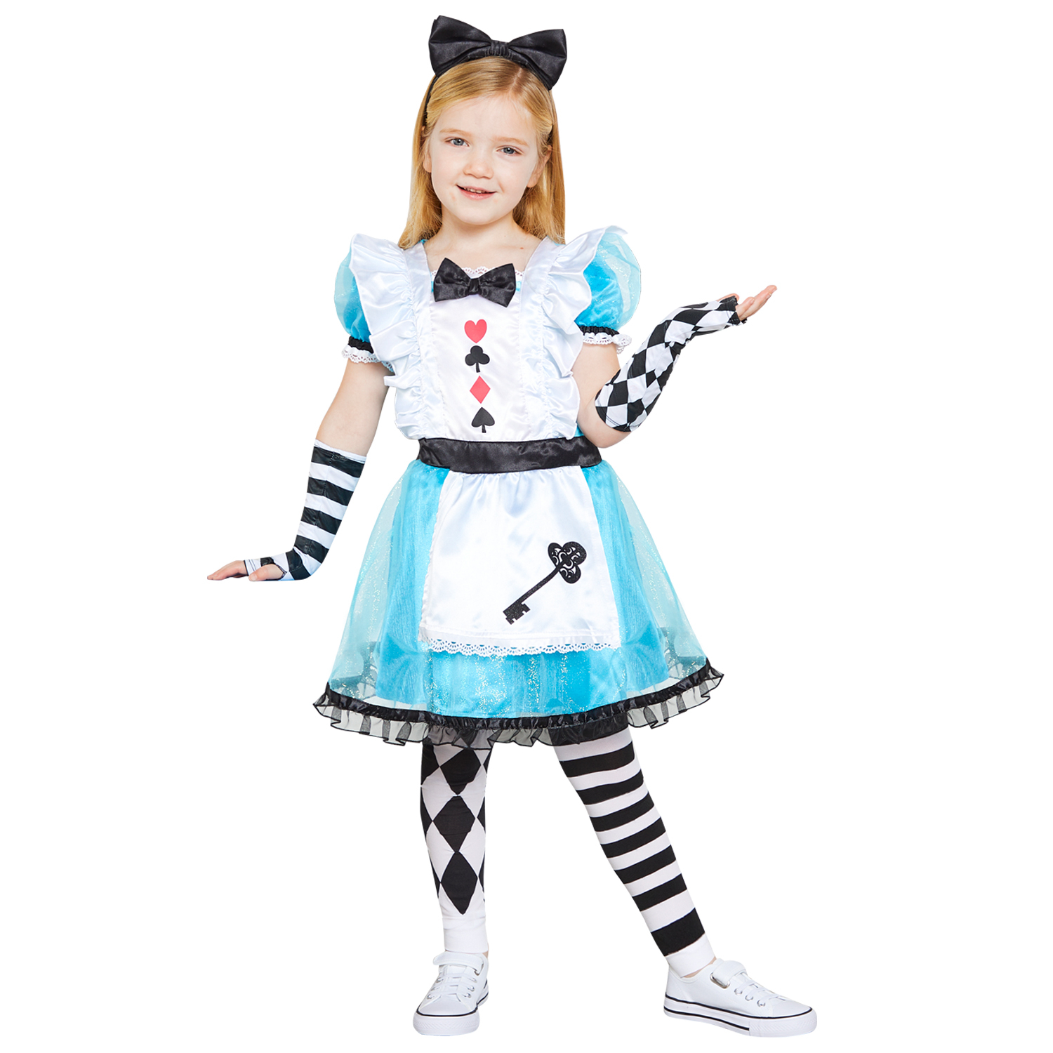 The blue Alice dress has sheer puff sleeves and buttons in the shape of playing cards. The attached white apron is trimmed with frills and features a black key on the front. The mismatched arm warmers and footless tights feature a black and white harlequin and striped pattern. Completed with a black hair bow.