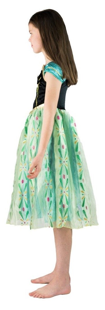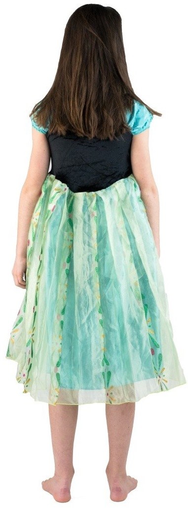 Become the heroine in your fairy tale in our Anna dress costume! The dress features a sequinned black bodice with a green floral printed skirt and gold detailing. The dress also features a white veil cape.