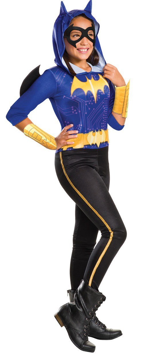 Transform your little princess into a superhero with this high quality Batgirl costume. The costume consists of a black tutu dress with gold Batman image print, gold belt with utility print, black cape, eye mask and black gauntlets with gold trim.