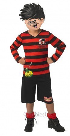 This Kids Dennis The Menace costume includes a red and black striped printed top and a pair of black three quarter lengths. To complete the look a plastic Dennis mask is also included.