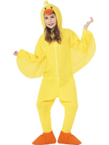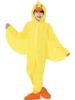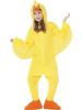 A fun, bright yellow Duck onesie with zip-up front and an attached hood with eyes and beak, attached shoe covers and wings.