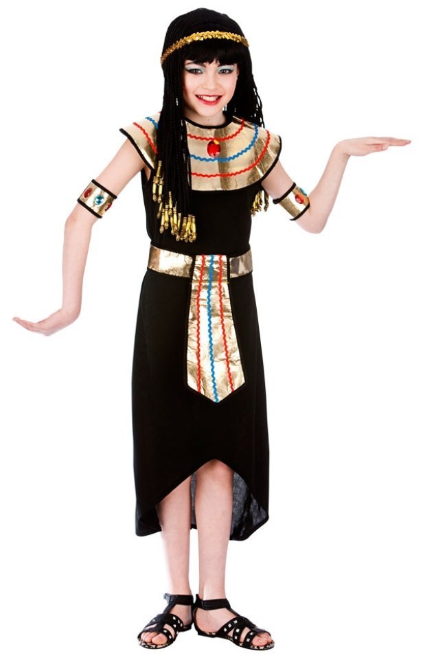 This Kids Egyptian queen includes a long black dress with belt and matching collar. Also included is a pair of arm cuffs and a headband.