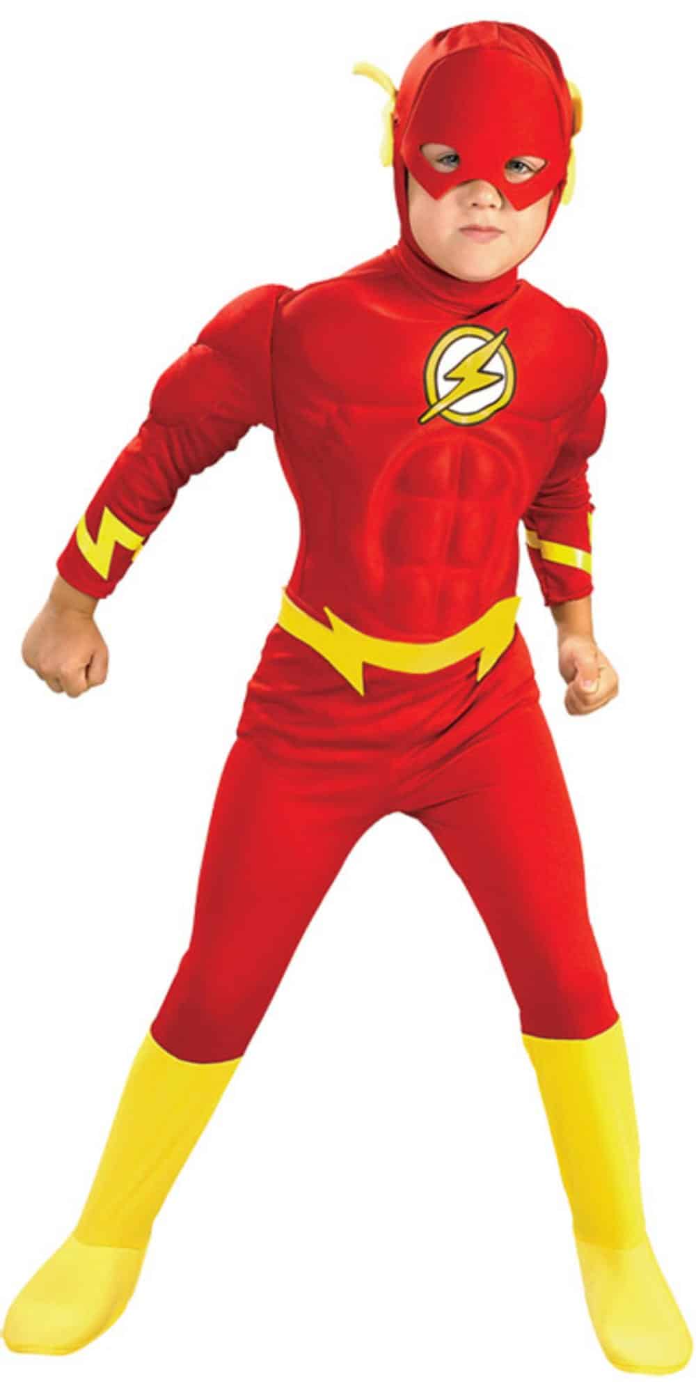 The kids Flash costume includes a one piece muscle chest jumpsuit with attached yellow boot tops, yellow belt and a matching headpiece.