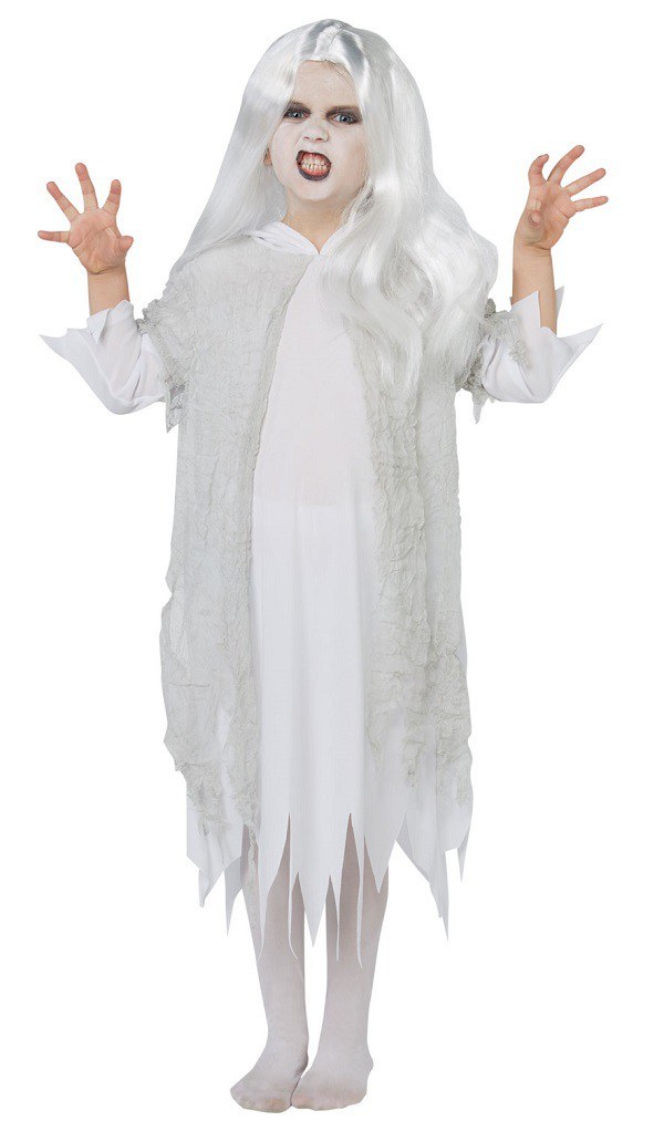This Kids Ghostly Spirit costume includes a long white hooded dress with a gauze overlay.