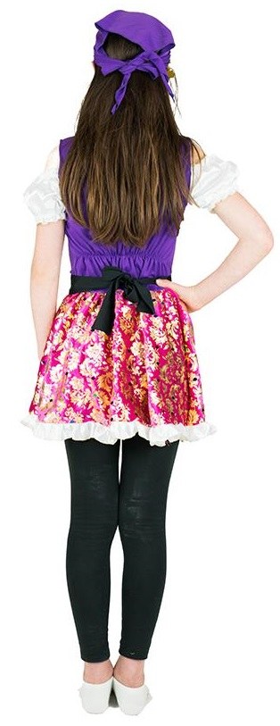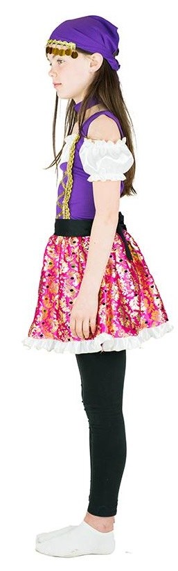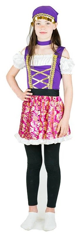 Kids Gypsy Girl Costume includes a colourful dress with off the shoulder sleeves and matching headpiece.