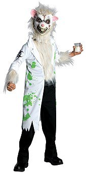 This Kids Lab Rat costume includes a white jacket with green specs and a jagged end with attached faux fur on the arms and around the neck. The costume also includes a half face mask with elastic to hold the mask onto your face.
