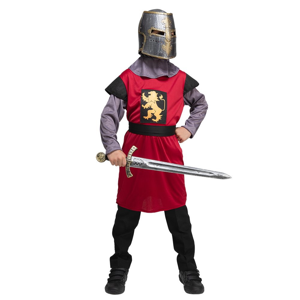 Transform your little one into a Medieval Knight with this noble costume. Included in this costume is a red and black tunic with dragon print and silver sleeves. The costume also includes a hood and a black belt.