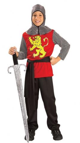 This Kids Medieval Lord costume includes a tunic with a printed lion and a hood with cowl. The costume also includes a black waist sash.