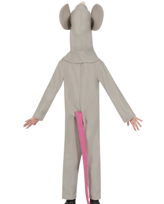 This Kids Mouse Costume is a grey jumpsuit with a mouse hood.