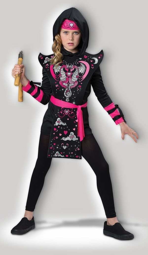 This Kids Ninja Girl Costume includes a black and pink detailed dress with an attached hood and a tabard with a glitter dragon print. The costume also features a pair of black leggings to match. To complete the look, a belt tie and head sash are also included. With this costume, you will be ready for whatever enemy stands in your path!