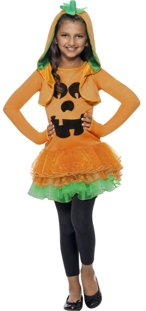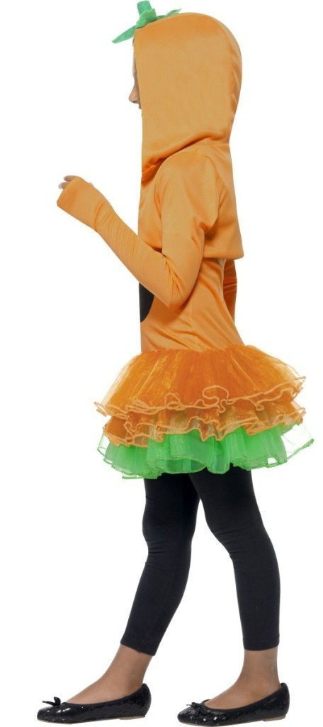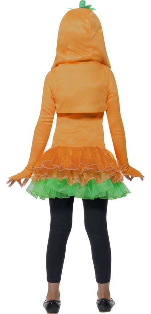 Kids Pumpkin costume includes an orange printed dress with a green and orange tutu style skirt. To complete the look an orange balero jacket with pumpkin hood is also included.