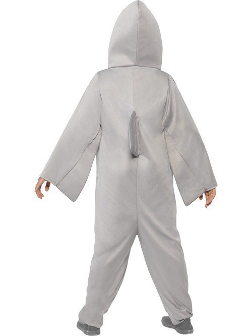 This Kids Shark includes a one piece grey jumpsuit with zip up front with attached shark hood and fins.