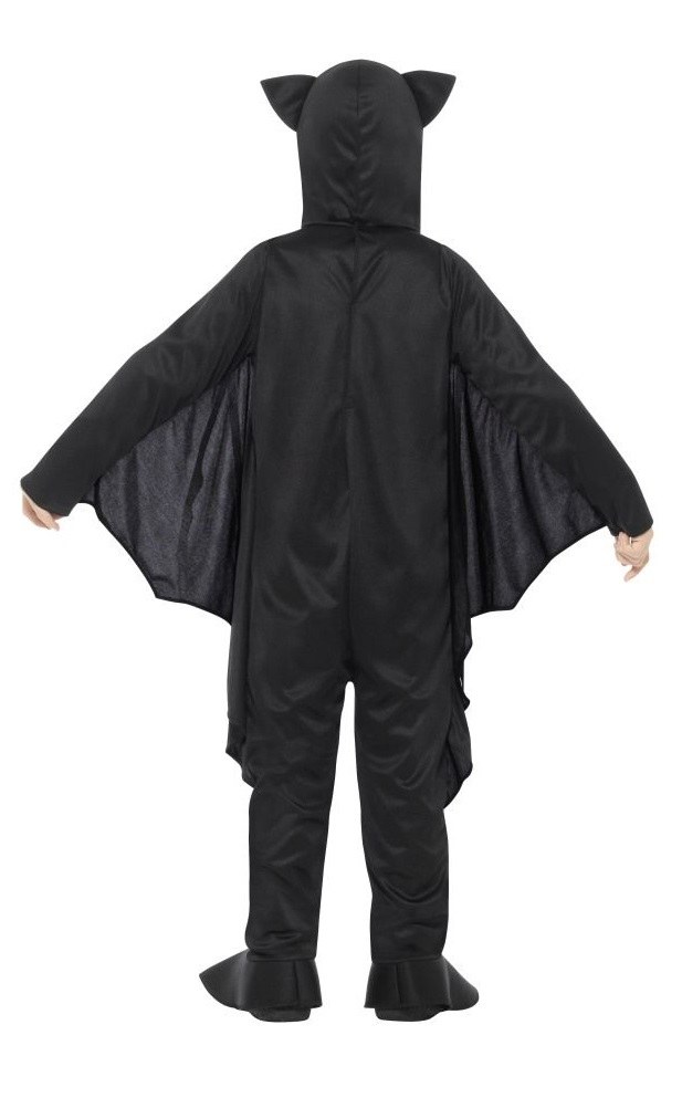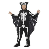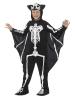 Kids Bat Skeleton Costume includes a skeleton print hooded bodysuit with attached bat wings.