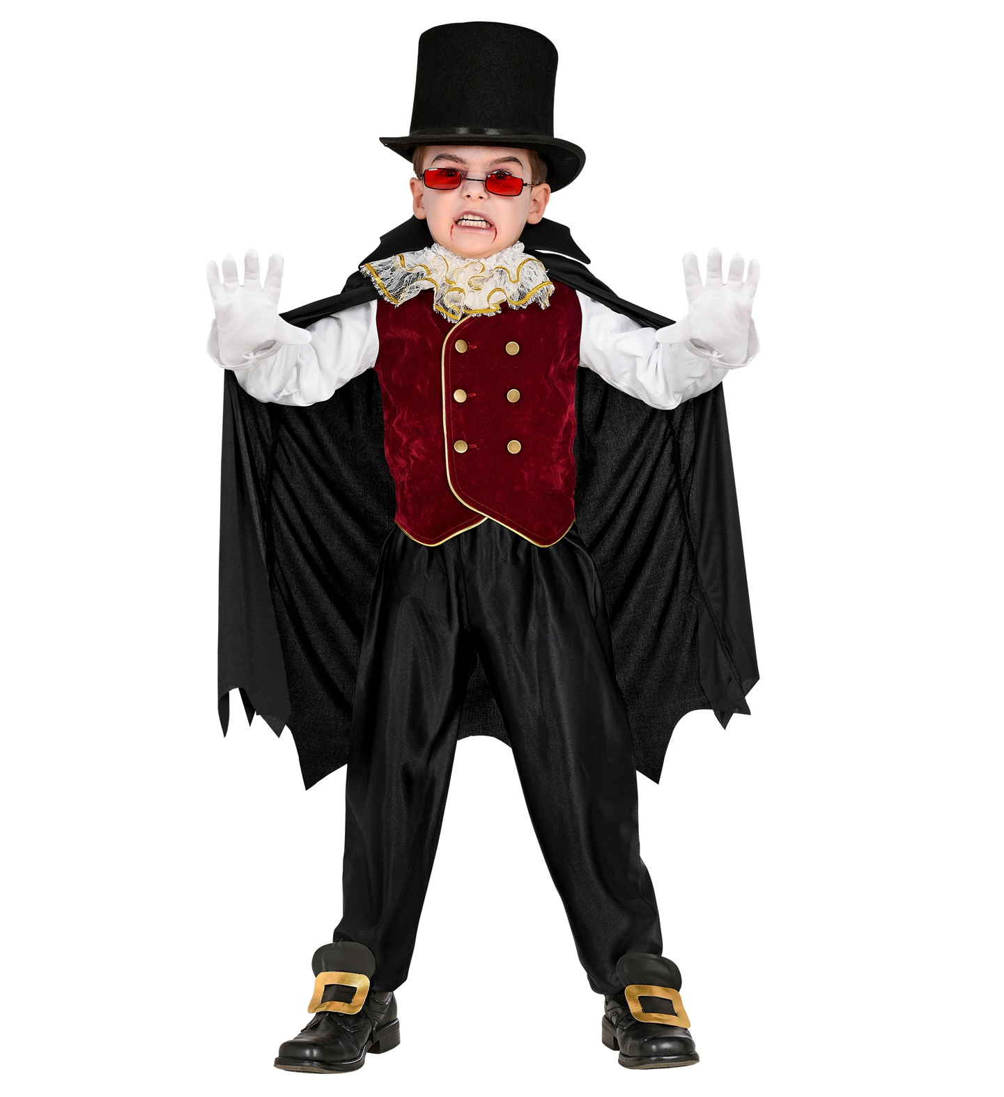 This Kids Vampire Costume includes a shirt with vest top.