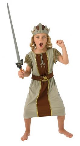 This Kids Viking Boy costume includes a long tunic with belt and a headpiece. To complete the look a sword is also included.