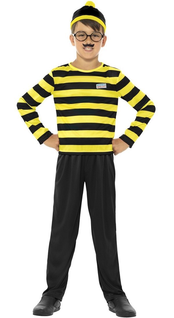 This Kids Where's Wally Odlaw costume includes a black and yellow striped top and a pair of black trousers. The costume also includes a yellow and black hat and a pair of black glasses frames.
