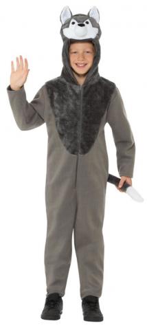 Get dressed up as a big bad wolf with this one piece grey jumpsuit with a zip up front, attached tail and a wolf hood.