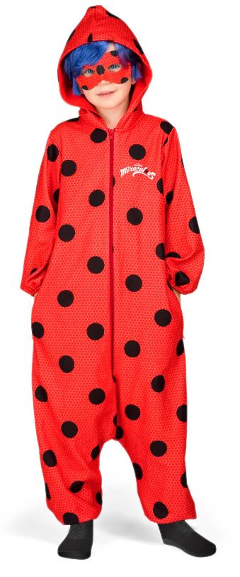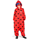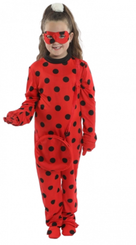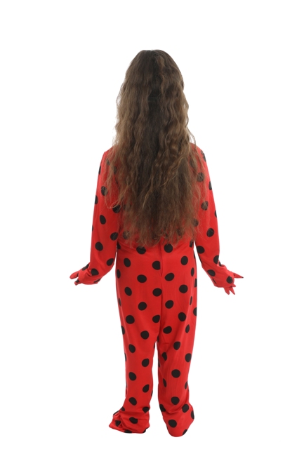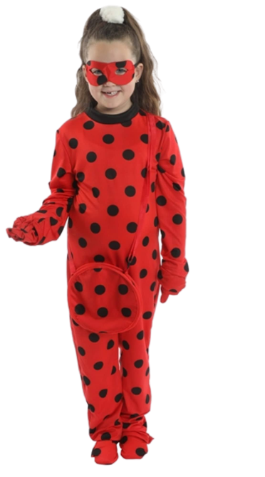 This Kids Ladybug Costume includes a red and black polka dot jumpsuit with matching eyemask and bag.