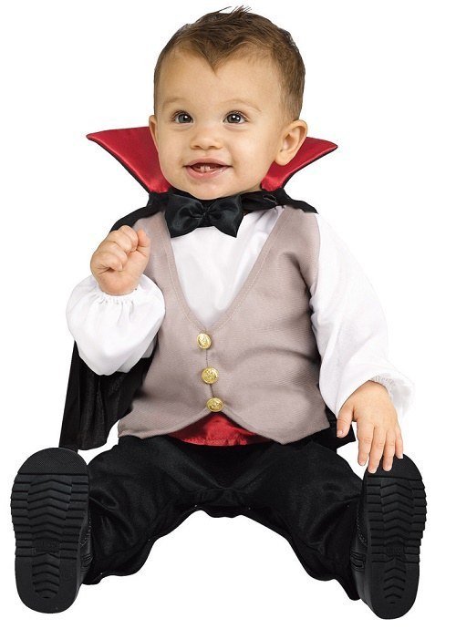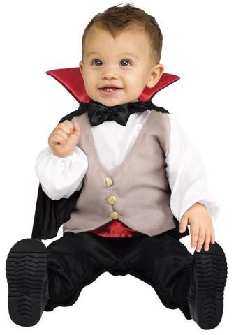 Our cute Li'l Drac Costume includes a on piece jumpsuit with attached waistcoat and open/close inseam. Also included is a cape with bow tie and collar.