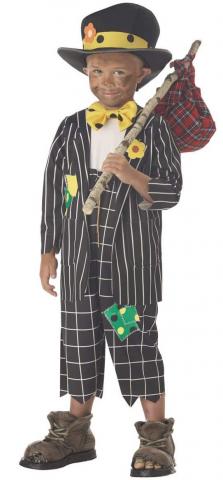 Lil Hobo Costume includes sleeveless jumpsuit with jagged ends, patchwork detail and attached dicky bow, jacket with pockets, patches and a lovely flower detail.