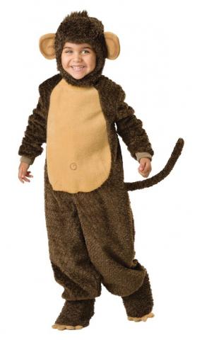 The adorable Toddler's Little Monkey costume features a soft, plush dark brown jumpsuit with tan coloured tummy, attached tail and a matching hood with adorable monkey ears.