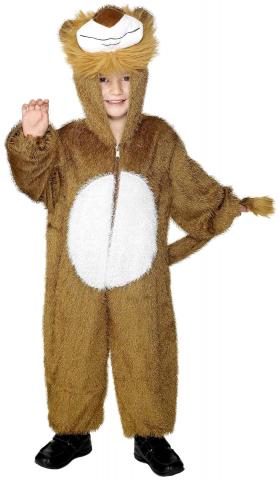 This Lion Costume includes a textured brown zip-up jumpsuit with white stomach and an attached hood with eyes, ears and mane.