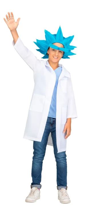 Mad Scientist Costume includes a white coat with a T-shirt and a wig with blue eyebrows.
