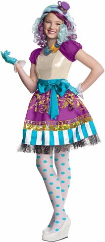The Kids Madeline Hatter Costume features a stunning purple, blue and cream detailed bow dress including cap sleeves with a blue sash to match. This costume also features white polka dot tights, polka dot gloves and a purple teacup hat headpiece. You will look more than ready to start Ever After High!