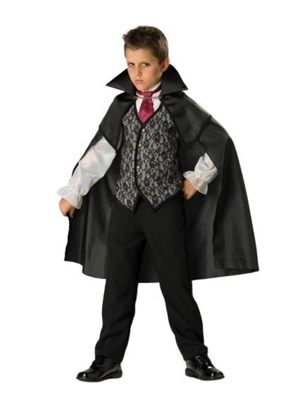 Become a true Midnight Vampire with this costume. This includes an extra full cape, pants with brocade-style vest with attached shirt sleeves, collar and dapper tie.