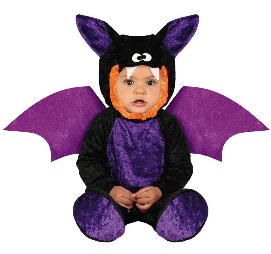 The adorable Mini Bat Costume includes a velvet black and purple jumpsuit. To complete the bat look an attached hood is also included.